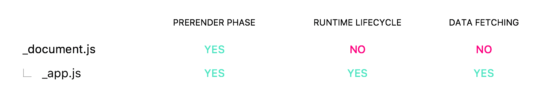 _document.js allows for powerful extensibility, but it has some serious limitations. For example, React is not able to render <html> or <body> directly on the client side, so _document.js is mostly limited to the initial pre-rendering phase.